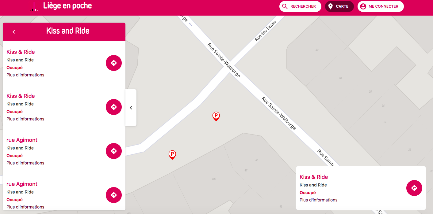 Cette application de la Ville de Liège reprend toute une série d’infos et services dont la mobilité. A partir de son smartphone (une version site web est également consultable), on accède à toute une série d’inforamtions comme les emplacements des places riverain, la localisation de boxs vélos, les zones kiss and ride, des horaires, les parkings motos… avec, ici aussi, des informations en temps réél. Il est par exemple possible de voir si un emplacement “kiss and ride” est libre ou si la rue de votre destination est réservée aux riverains (et donc d’éviter une amende).